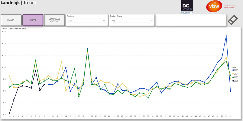 Deze inzichten zijn afkomstig uit het datadashboard van DC Online. In het dashboard worden op basis van 288 datapunten (geanonimiseerd) gemiddelde verkoopdata geregistreerd. Op die manier beschikken we over actueel inzicht in de branche. Het dashboard is ook beschikbaar voor bloemisten, waardoor individuele verkoopcijfers vergeleken kunnen worden met branchegemiddelden.