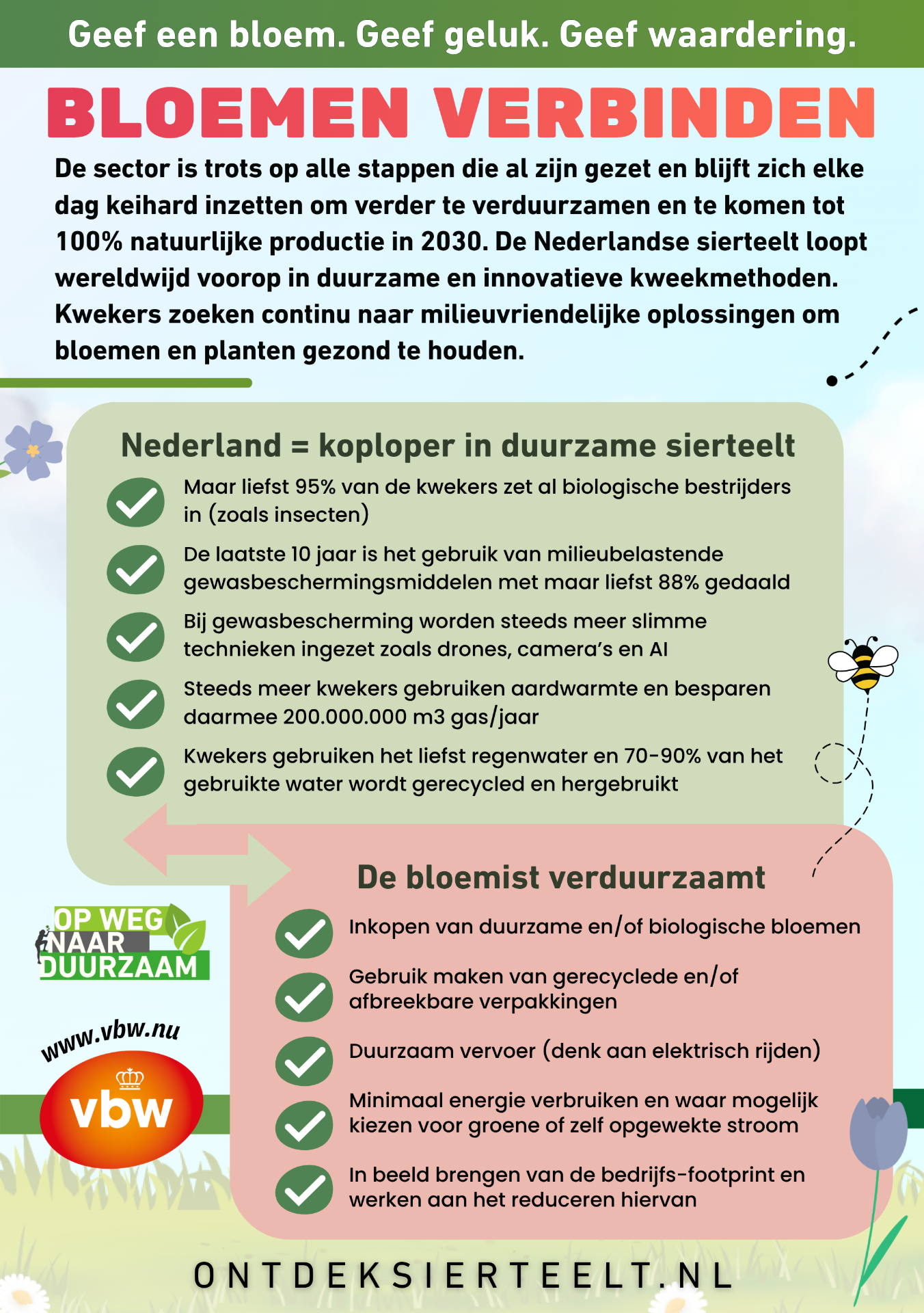 In de afgelopen periode heeft VBW samen met diverse partijen nieuwe feiten verzameld over verduurzamingsstappen die we als sector zetten. De belangrijkste feiten zijn opgenomen in een flyer die jij kan inzetten richting je klanten. Deze flyer komt ter vervanging van de eerdere versie die voor Moederdag is verspreid. De link gaat naar ontdeksierteelt.nl, die vanaf 20 november live gaat.